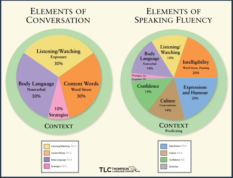 The Elements of Conversation and Fluency showcases the aspects of successful communication and their relative importance. Learners worry less about what isn’t important and experience better, real-world results
