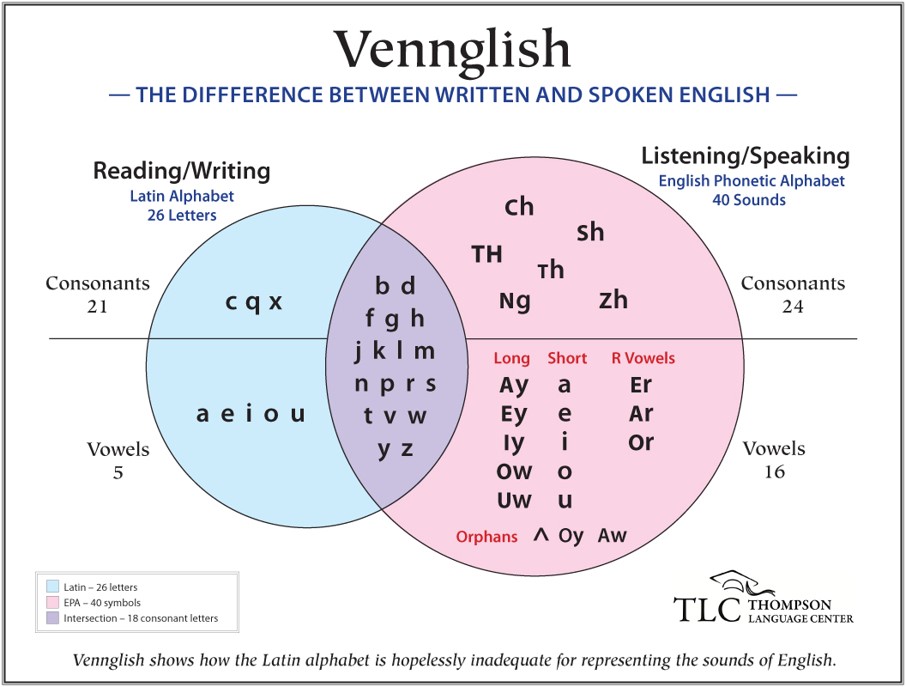 Vennglish compares the 26 symbols used in writing to the 40 symbols that represent English sounds. This poster shows how and where the Roman or Latin or ABC alphabet falls short of representing English.