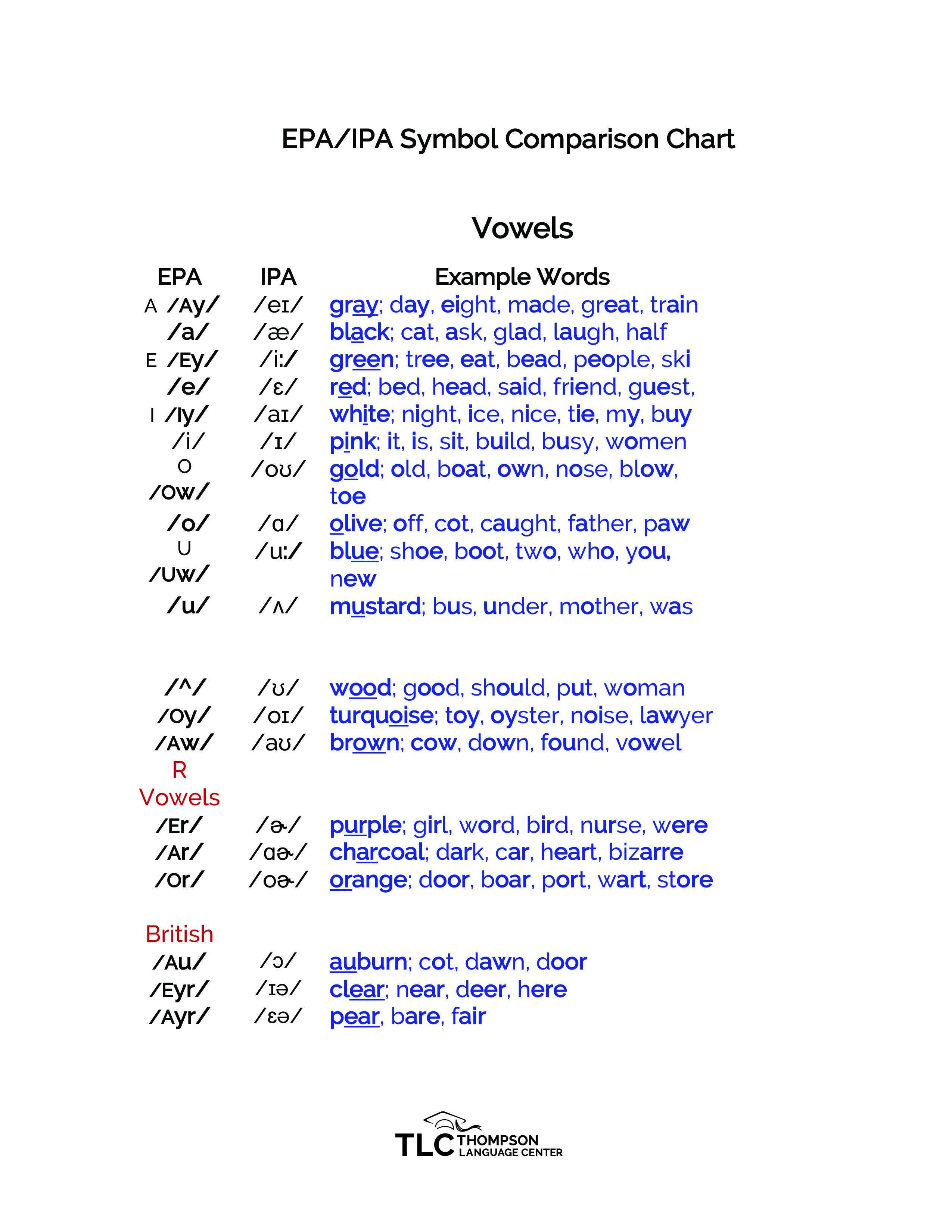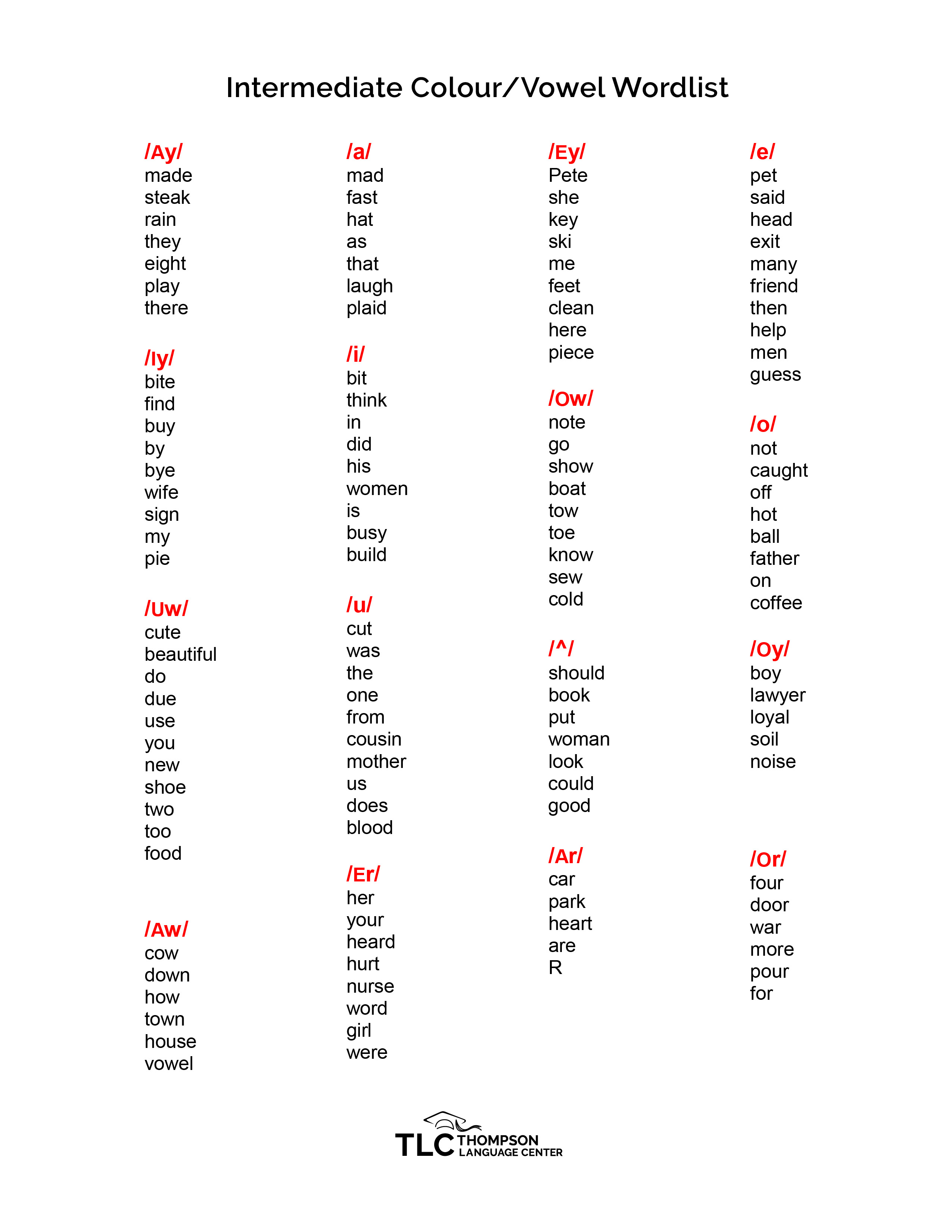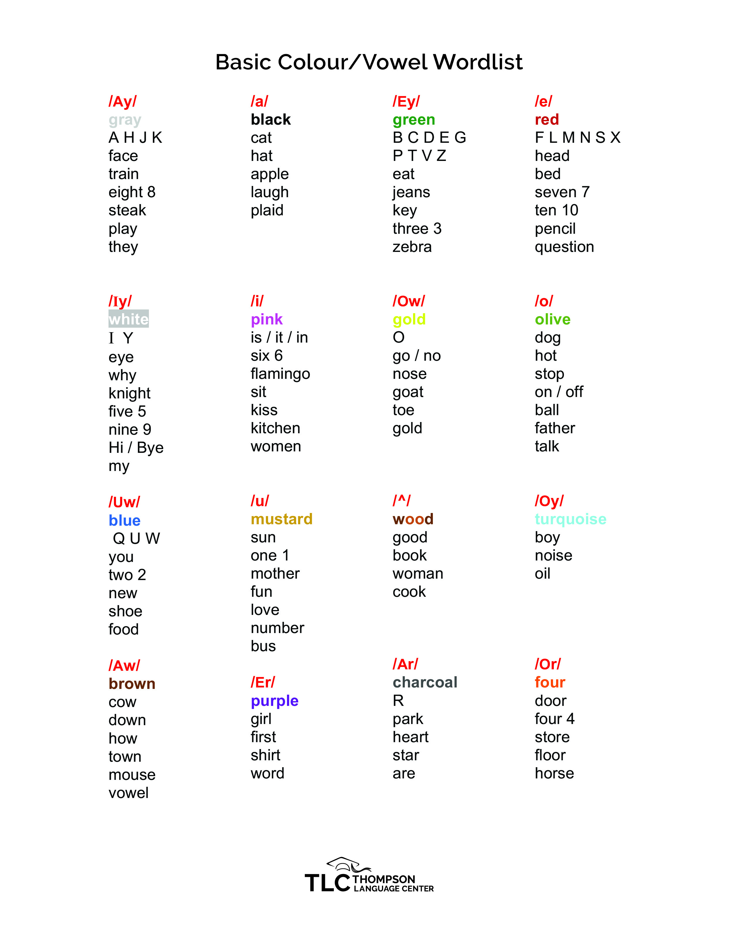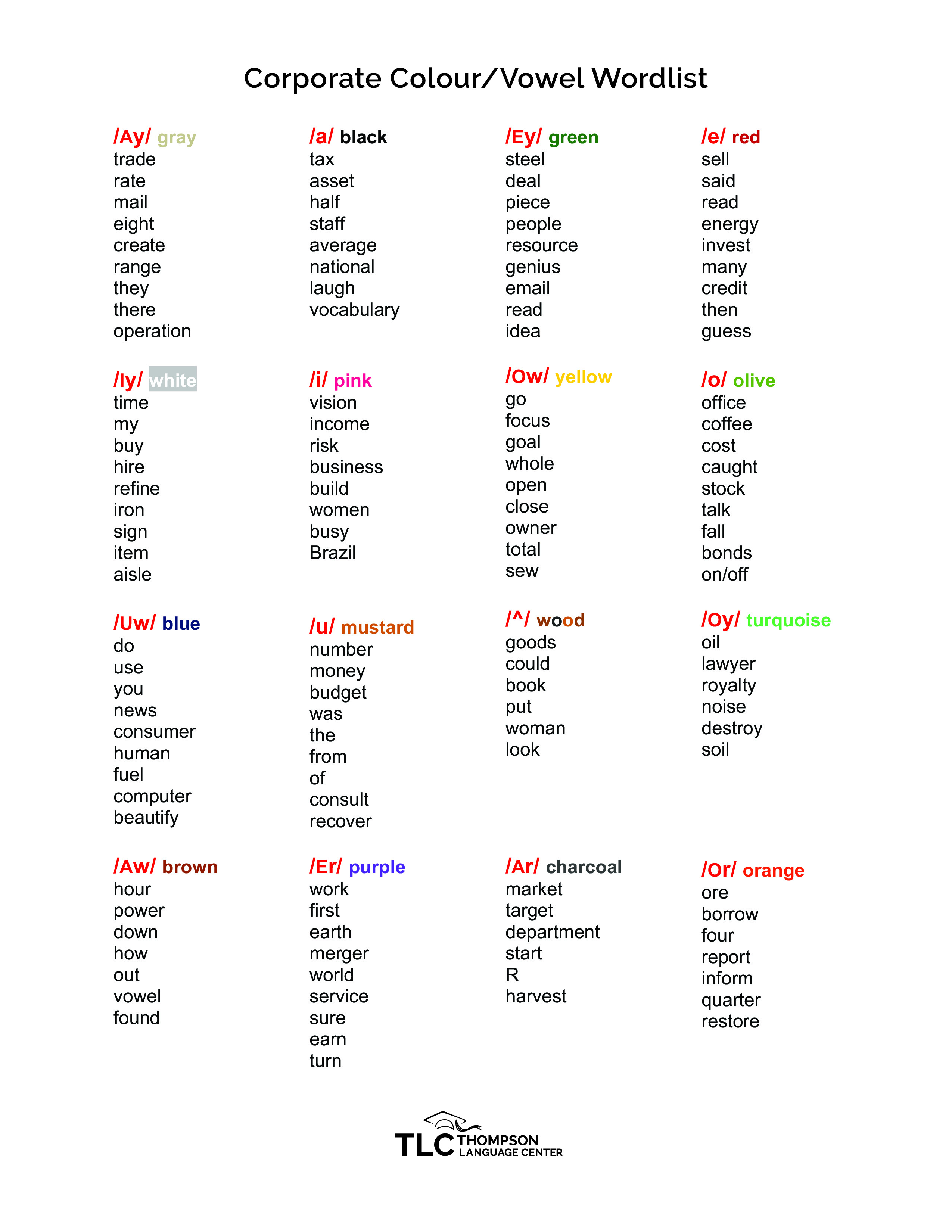 • With a good set of colored pencils (Staples brand) and a class set of this document, students create their own TLC Vowel Chart and the pronunciation of every word in English goes home with them