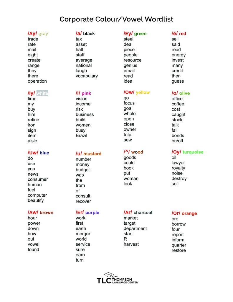 Pronouncing English confidently is fun and easy with the Thompson Vowel Chart color connection found in Book 1 on Pronunciation.